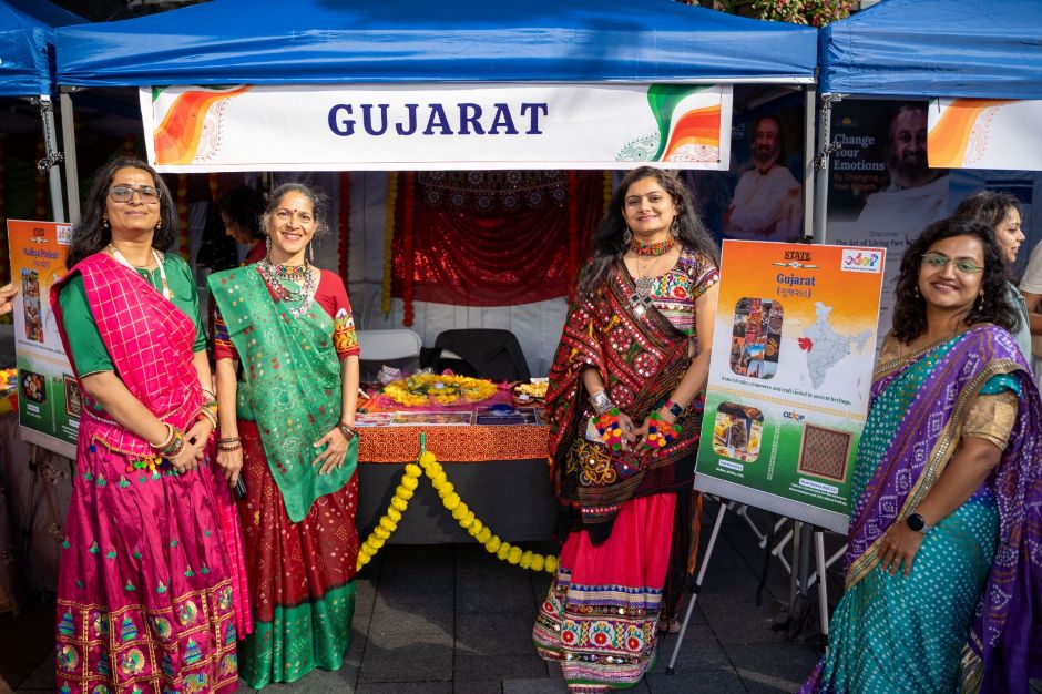 સિએટલમાં પ્રથમ ભારત દિવસ પરેડના ભાગરૂપે ભારત મંડપમાં ગુજરાત બૂથનું પ્રતિનિધિત્વ કરતા સહભાગીઓ. / Courtesy Photo