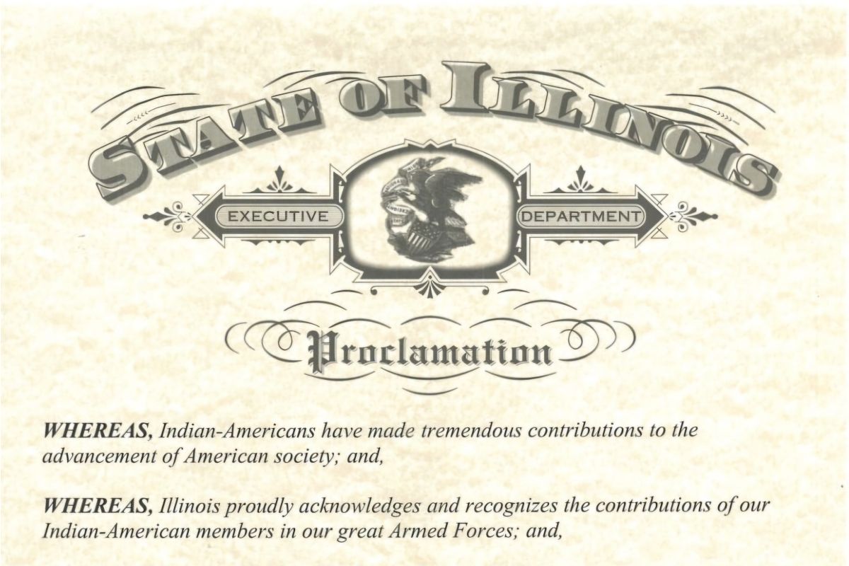 જાહેરનામામાં જણાવાયું છે, “ભારતીય-અમેરિકનોએ અમેરિકન સમાજની પ્રગતિમાં અદ્ભુત યોગદાન આપ્યું છે; અને ઇલિનોઇસ અમારા મહાન સશસ્ત્ર દળોમાં ભારતીય-અમેરિકન સભ્યોના યોગદાનને ગૌરવપૂર્વક સ્વીકારે છે અને માન્યતા આપે છે.”