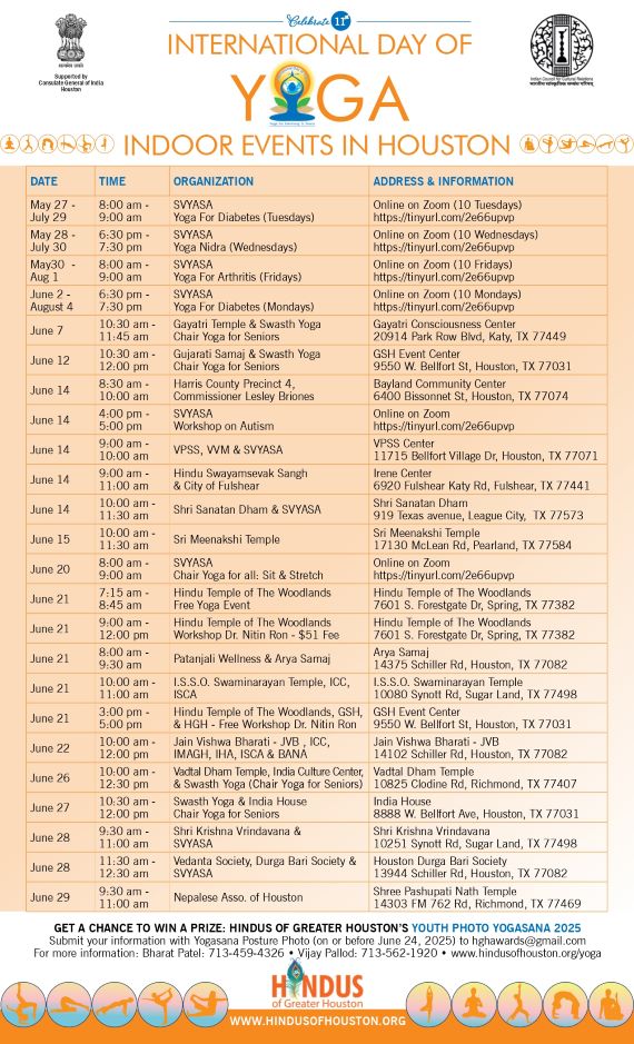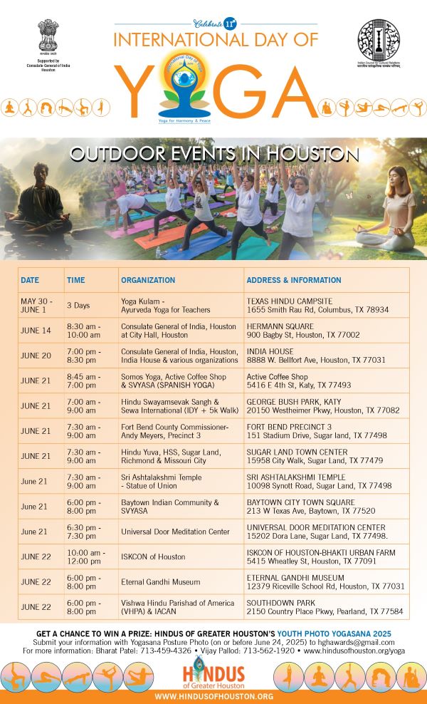 હ્યુસ્ટનમાં ભારતના કોન્સ્યુલેટ જનરલ 21 જૂન, 2025ના રોજ 11મા આંતરરાષ્ટ્રીય યોગ દિવસ (IDY)ની ઉજવણીનું નેતૃત્વ કરી રહ્યું છે, જેમાં ગ્રેટર હ્યુસ્ટનમાં 30થી વધુ કાર્યક્રમોનું આયોજન કરવામાં આવ્યું છે.