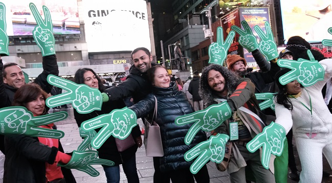 સાધુ વાસવાની સેન્ટર ફોર વર્લ્ડ પીસ દ્વારા આયોજિત આ અભૂતપૂર્વ ઝુંબેશમાં 25 નવેમ્બરના રોજ ઉજવવામાં આવતા આંતરરાષ્ટ્રીય માંસ વિનાના દિવસના સન્માનમાં હજારો ન્યૂ યોર્કવાસીઓને 'ટેક ધ વેજ' કરવા વિનંતી કરવામાં આવી હતી. / Neha Lohia