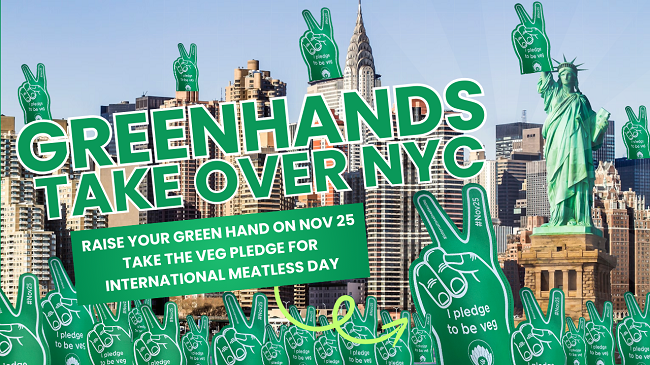 ન્યૂયોર્ક શહેરની શોરબકોર કરતી શેરીઓ કરુણા, સ્થિરતા અને એકતાના શક્તિશાળી સંદેશમાં પરિવર્તિત થઈ ગઈ હતી. ગ્રીન હેન્ડ્સ ચળવળ ચેલ્સિયા માર્કેટ, મીટપેકિંગ ડિસ્ટ્રિક્ટ, લિટલ આઇલેન્ડ અને ટાઇમ્સ સ્ક્વેર પર પ્રભુત્વ ધરાવે છે. સાધુ વાસવાની સેન્ટર ફોર વર્લ્ડ પીસ દ્વારા આયોજિત આ અભૂતપૂર્વ ઝુંબેશમાં 25 નવેમ્બરના રોજ ઉજવવામાં આવતા આંતરરાષ્ટ્રીય માંસ વિનાના દિવસના સન્માનમાં હજારો ન્યૂ યોર્કવાસીઓને 'ટેક ધ વેજ' કરવા વિનંતી કરવામાં આવી હતી.