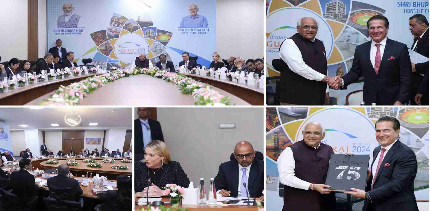 વાઈબ્રન્ટ ગુજરાત ગ્લોબલ સમિટ 2024ની સાથે યોજાયેલી ગુજરાતના માનનીય મુખ્યમંત્રી શ્રી ભૂપેન્દ્ર પટેલ સાથેની રચનાત્મક રાઉન્ડ ટેબલ મીટિંગમાં યુએસ-ઈન્ડિયા સ્ટ્રેટેજિક પાર્ટનરશિપ ફોરમ (યુએસઆઈએસપીએફ)ના પ્રમુખ અને સીઇઓ ડૉ. મુકેશ આઘીના નેતૃત્વમાં USISPFના ઉચ્ચ સ્તરીય પ્રતિનિધિમંડળે ભાગ લીધો હતો.