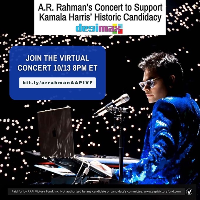 A.R. રહેમાન કમલા હેરિસને રાષ્ટ્રપતિ પદ માટે સમર્થન આપવા માટે પ્રદર્શન કરે છે. / X @AAPIVictoryFund