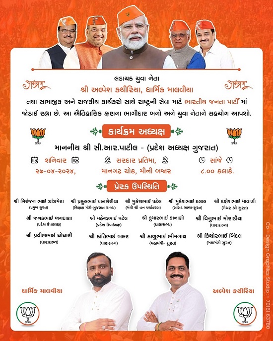 Invitation card / Dharmik Malaviyaરાજીનામું આપ્યા બાદ એવી અટકળો શરૂ થઈ હતી કે, અલ્પેશ અને ધાર્મિક બંને ભાજપમાં જોડાઈ જશે. આ દરમિયાન જ શહેરના સરથાણા વિસ્તારમાં એક ફાર્મ હાઉસમાં પાટીદાર સમાજના આગેવાનો સાથે બેઠક પણ કરવામાં આવી હતી. ત્યારબાદ આ બેઠકમાં બંને યુવા નેતાઓ દ્વારા ભાજપમાં જોડાવાનો નિર્ણય લેવાયો હતો. જેને પગલે ધાર્મિક માલવિયા અને અલ્પેશ કથીરિયા બંને પાટીદાર યુવા નેતાઓ 200 જેટલા પાટીદાર સમાજના આગેવાનો અને યુવાઓ સાથે ભાજપ પ્રદેશ પ્રમુખ સી.આર પાટીલના હસ્તે કેસરિયો ધારણ કરશે.