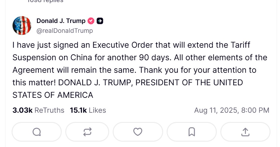 રાષ્ટ્રપતિ ટ્રમ્પે ટ્રુથ સોશિયલ પર પોસ્ટ કર્યું: “મેં હમણાં જ ચીન પરના ટેરિફ સ્થગિત રાખવાનો સમયગાળો વધુ 90 દિવસ માટે લંબાવવાનો એક્ઝિક્યુટિવ ઓર્ડર સહી કર્યો છે. કરારના અન્ય તમામ તત્વો યથાવત રહેશે.”