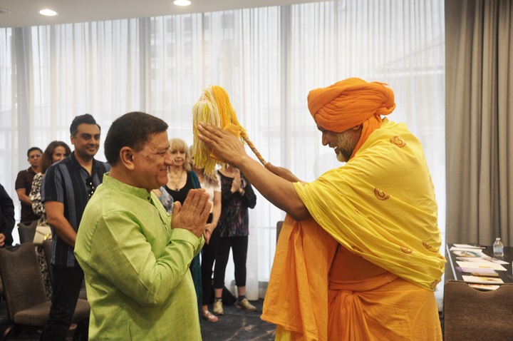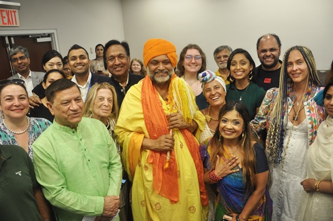 ન્યૂયોર્કના મેનહટનમાં મેરિયટ માર્કિસ ખાતે એક કાર્યક્રમમાં ઉપસ્થિત લોકો સાથે સિદ્ધગુરુ. / Rob Klein and Chirstine Mendes