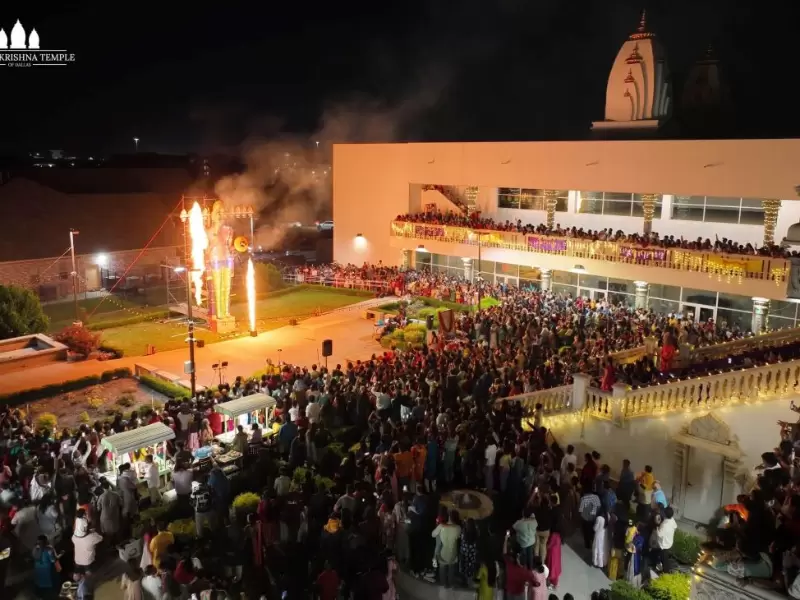 ભારતીય સંસ્કૃતિની ઉજવણી / Radha Krishna Temple of Dallasઉત્સવનું સમાપન 1 ઓક્ટોબરે મંદિરના આંગણામાં દશેરાની ભવ્ય ઉજવણી સાથે થઈ. આ સાંજનું મુખ્ય આકર્ષણ રામલીલાનું પ્રેરણાદાયી પ્રદર્શન હતું, જેના પછી રાવણ દહનનો કાર્યક્રમ યોજાયો. 27 ફૂટ ઊંચી રાવણની પ્રતિમાને ભવ્ય આતશબાજીની વચ્ચે દહન કરવામાં આવ્યું, જેની સાથે હજારો લોકોએ “જય શ્રી રામ!”ના નારા લગાવ્યા. આ પળે રાતનું આકાશ પ્રકાશમય બન્યું અને ભક્તિ તેમજ દેશભક્તિનો અનુભવ થયો.