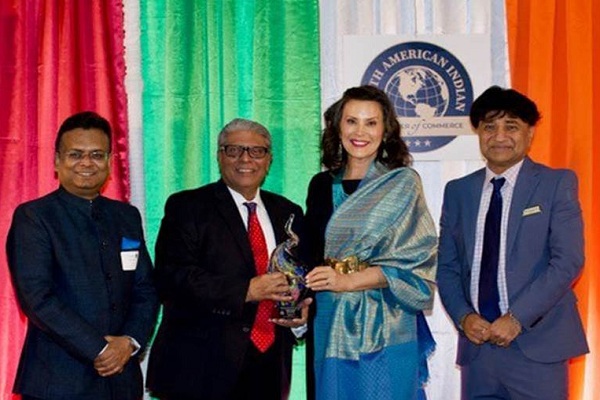 बाएं से दाएं : भारत के काउंसिल जनरल सोमनाथ घोष, स्काई बर्ड ग्रुप के अध्यक्ष अरविन शाह, मिशिगन की गवर्नर ग्रेचेन व्हिटमर और NAICC के अध्यक्ष श्री धवल वैष्णव। / NAICC