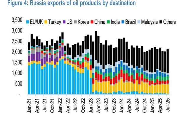 जेपी मॉर्गन कमोडिटीज रिसर्च और उद्योग स्रोतों के आंकड़ों के अनुसार दिसंबर 2022 से जुलाई 2025 तक रूस के परिष्कृत तेल उत्पाद निर्यात में तुर्की की हिस्सेदारी 26% थी। चीन 13% और ब्राजील 12% के साथ तीसरे स्थान पर था। भारत इस श्रेणी में शीर्ष पांच खरीदारों में से नहीं है।