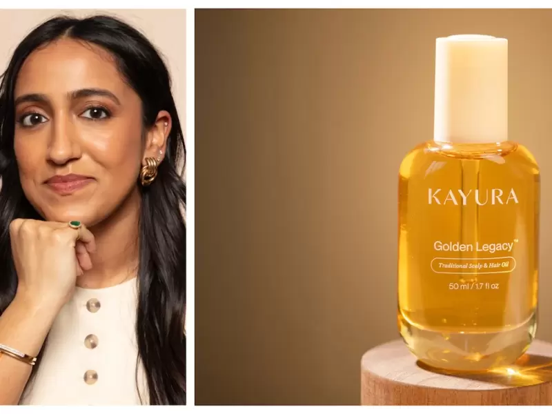 कायूरा की संस्थापक कानन पटेल, (दाएं) गोल्डन लेगेसी™ हेयर ऑयल। / Kayura website
