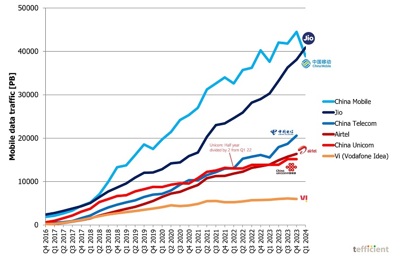 कंपनी ने 2023 की अंतिम तिमाही में ही जियो की इस उल्लेखनीय उपलब्धि की भविष्यवाणी कर दी थी। उसने पाया कि जनवरी से मार्च 2024 के दौरान जियो का कुल डेटा ट्रैफ़िक चाइना मोबाइल के 38.9 एक्साबाइट को पार करके 40.9 एक्साबाइट तक पहुंच गया था। इस तरह वह मोबाइल उपकरणों में दुनिया का नंबर वन डेटा करियर बन गई।