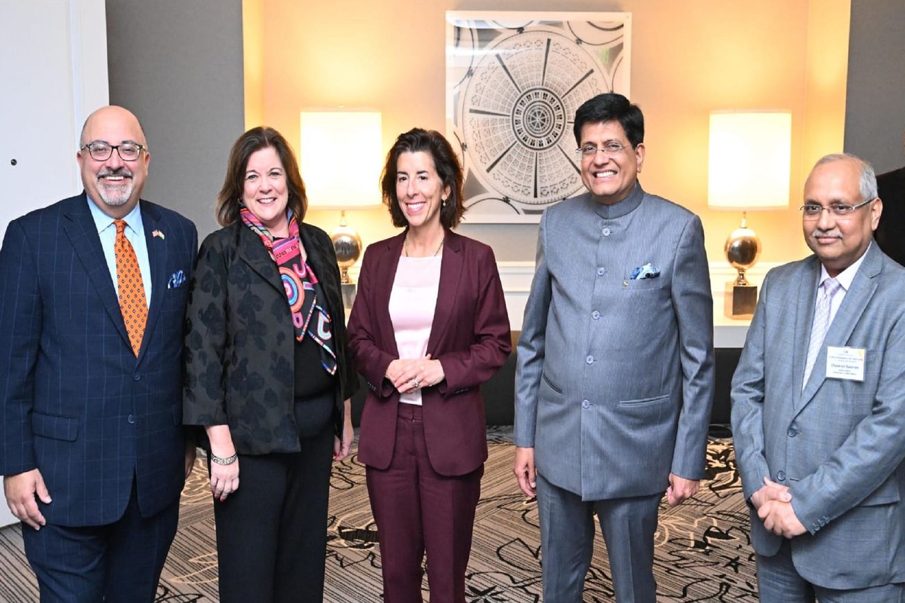 अमेरिकी वाणिज्य सचिव जीना रायमोंडो और भारतीय वाणिज्य मंत्री पीयूष गोयल (बाएं से तीसरे और चौथे स्थान पर) के साथ दोनों देशों के अधिकारी। / Image : X@CII