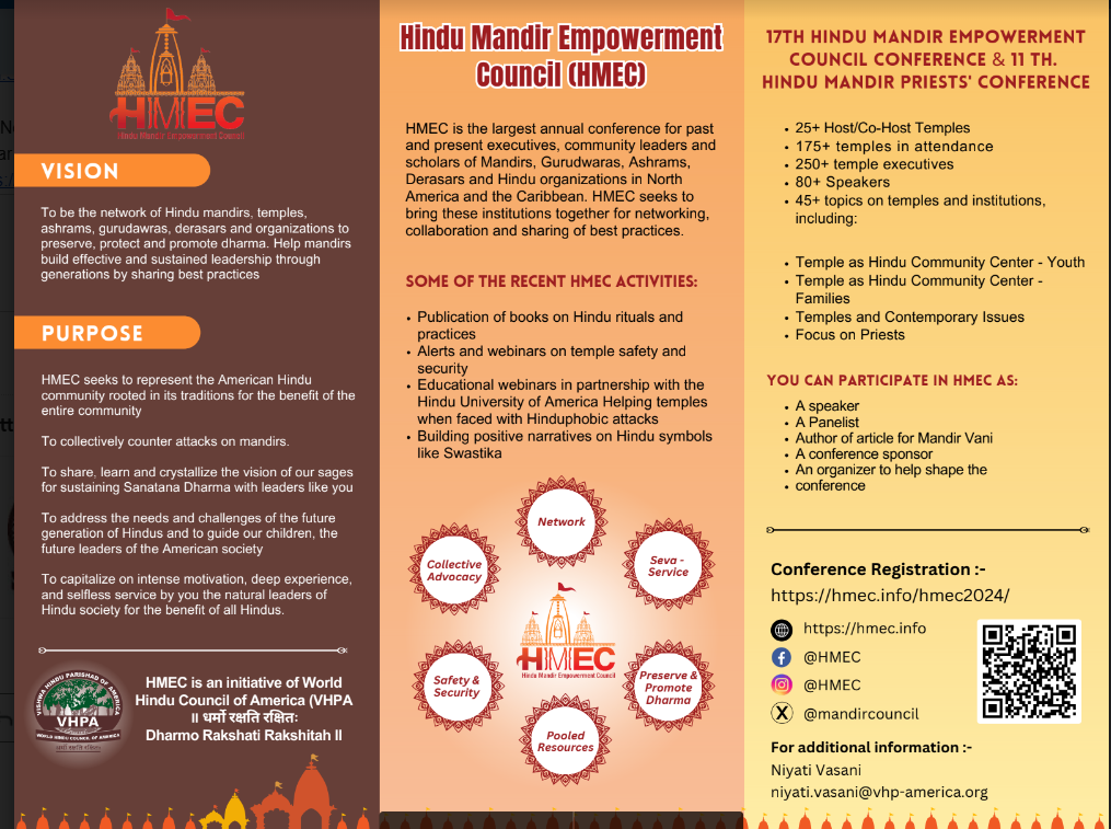 हिंदू मंदिर एम्पावरमेंट काउंसिल (HMEC) अमेरिका, कनाडा और कैरिबियन द्वीप समूह में सभी मंदिरों और उनके प्रतिनिधियों को 17वें हिंदू मंदिर एम्पावरमेंट काउंसिल सम्मेलन और 11वें हिंदू मंदिर पुजारियों के सम्मेलन (HMPC) के लिए आमंत्रित किया है। यह सम्मेलन 27, 28 और 29 सितंबर 2024 को रैले, उत्तरी कैरोलिना (Raleigh) में आयोजित किया जाएगा।