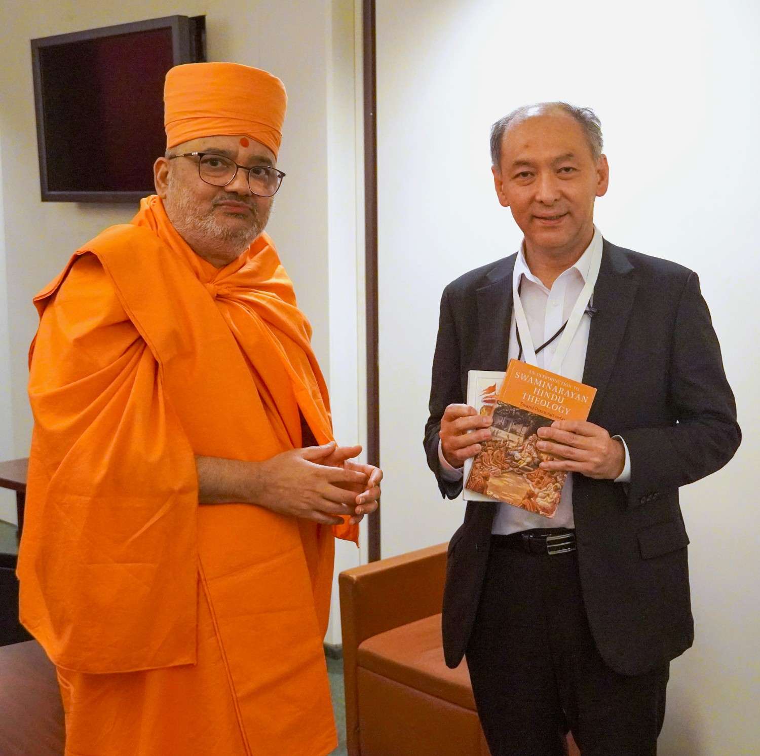 दार्शनिक चर्चा के बाद प्रोफेसर लुका स्कारंटिनो ने वेदांत प्रस्थानत्रयी पर स्वामीनारायण परंपरा में अक्षर-पुरुषोत्तम दर्शन के सिद्धांतों को शास्त्रीय रूप से संस्कृत में उजागर करने वाले भाष्य 'स्वामीनारायण भाष्यम' को उसके रचयिता महामहोपाध्याय भद्रेशदास स्वामी से प्राप्त कर प्रसन्नता व्यक्त की।