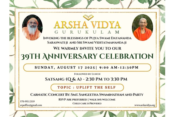 पेंसिल्वेनिया में आर्ष विद्या गुरुकुलम अपनी अपनी स्थापना के 39 वर्ष पूरा करने जा रहा है। 17 अगस्त को संस्था इस अवसर पर भव्य आयोजन करने जा रही है, जिसमें सांस्कृति कार्यक्रमों के अलावा जवाबी सत्संग, वॉक-इन होगा। संगीत कार्यक्रम के लिए कलाकार संगीता स्वामीनाथन को आमंत्रित किया गया है। गुरुकुल के कार्यक्रम का उद्देश्य संस्था की स्थापना का उद्देश्य और शिक्षा को लेकर गुरुकुल सभ्यता से लोगों को अवगत कराना है।