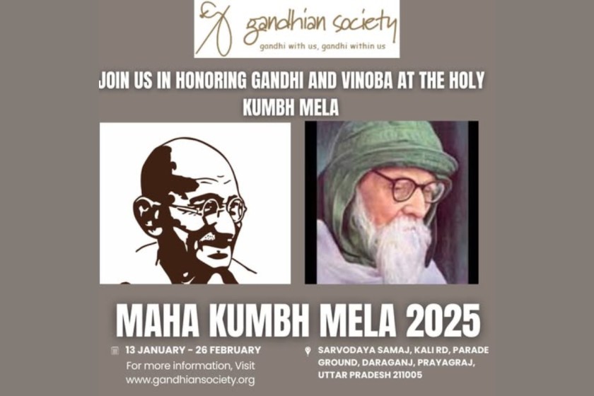 प्रयागराज में कुंभ मेले में गांधीयन सोसाइटी महात्मा गांधी और आचार्य विनोबा भावे की जिंदगी और उनकी सीख को याद करने का एक कार्यक्रम का आयोजन कर रही है। यह कार्यक्रम सर्वोदय समाज में हो रहा है। यह दारागंज के परेड ग्राउंड, काली रोड पर है। कार्यक्रम 26 फरवरी तक चलेगा। इसका मकसद इन दोनों महान नेताओं के काम और उनकी बातों को याद रखना है।सच्चाई, अहिंसा और इंसानियत का उनका संदेश आज भी दुनिया भर में गूंजता है।