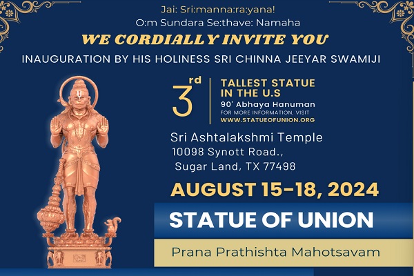 चार दिन चलने वाला महोत्सव 15 अगस्त से शुरू होगा और 18 अगस्त को प्राण प्रतिष्ठा के साथ संपन्न होगा। अभय हनुमान प्रतिमा की ऊंचाई 90 फुट है और टेक्सास की इस सबसे बड़ी मूर्ति को स्टेच्यू ऑफ यूनियन नाम दिया गया है।
