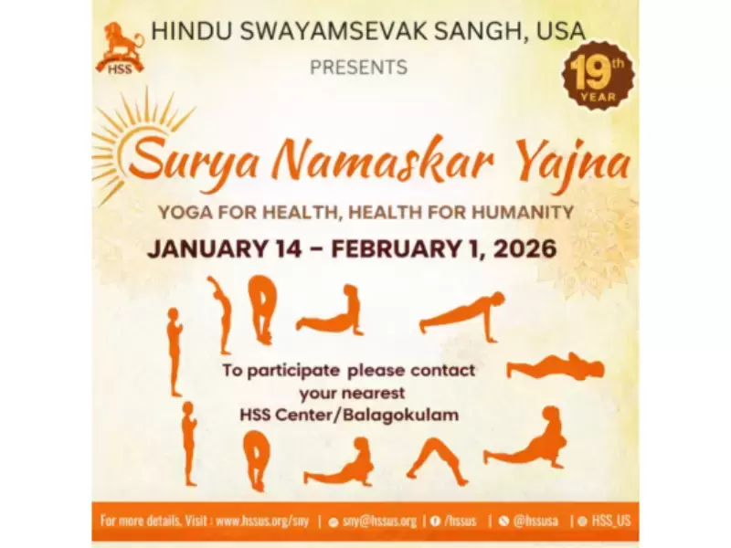 हिंदू स्वयंसेवक संघ (HSS) यूएसए ने अपने वार्षिक राष्ट्रीय कार्यक्रम “योग फॉर हेल्थ, हेल्थ फॉर ह्यूमैनिटी योगाथॉन” (सूर्य नमस्कार यज्ञ – SNY) के 19वें संस्करण की घोषणा की है। यह आयोजन 14 जनवरी से 1 फरवरी तक पूरे अमेरिका में किया जाएगा। कार्यक्रम का उद्देश्य स्वास्थ्य के प्रति जागरूकता बढ़ाना और सामूहिक कल्याण को प्रोत्साहित करना है। इसमें अमेरिका भर के सभी आयु वर्ग और पृष्ठभूमि के लोग भाग ले सकते हैं।