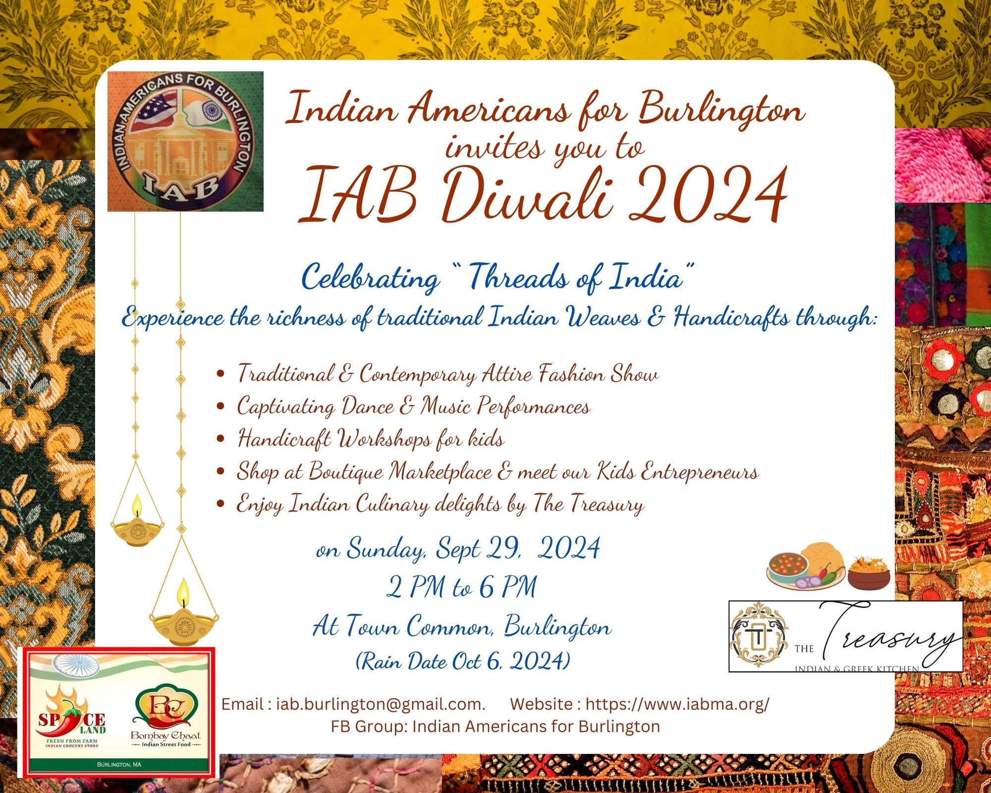 अमेरिका में इस साल दिवाली एक अनोखे अंदाज में मनाने की तैयारी है। इंडियन अमेरिकन्स फॉर बरलिंगटन (IAB) रविवार, 29 सितंबर को बरलिंगटन कॉमन्स में 'थ्रेड्स ऑफ इंडिया' थीम को जीवंत करने जा रहा है। दोपहर 2 बजे से शाम 6 बजे तक यह जीवंत कार्यक्रम भारत के पारंपरिक बुनाई और हस्तशिल्प की समृद्धि और विविधता को प्रदर्शित करेगा। कई गतिविधियों के के साथ, 'IAB दिवाली 2024' का लक्ष्य सभी उम्र के लोगों को मोहित करना है।