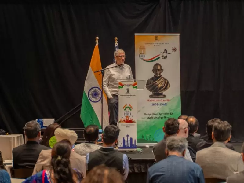 गेट्स फाउंडेशन के अध्यक्ष और बोर्ड सदस्य बिल गेट्स गांधी जयंती समारोह को संबोधित करते हुए। / Consulate General of India, Seattle