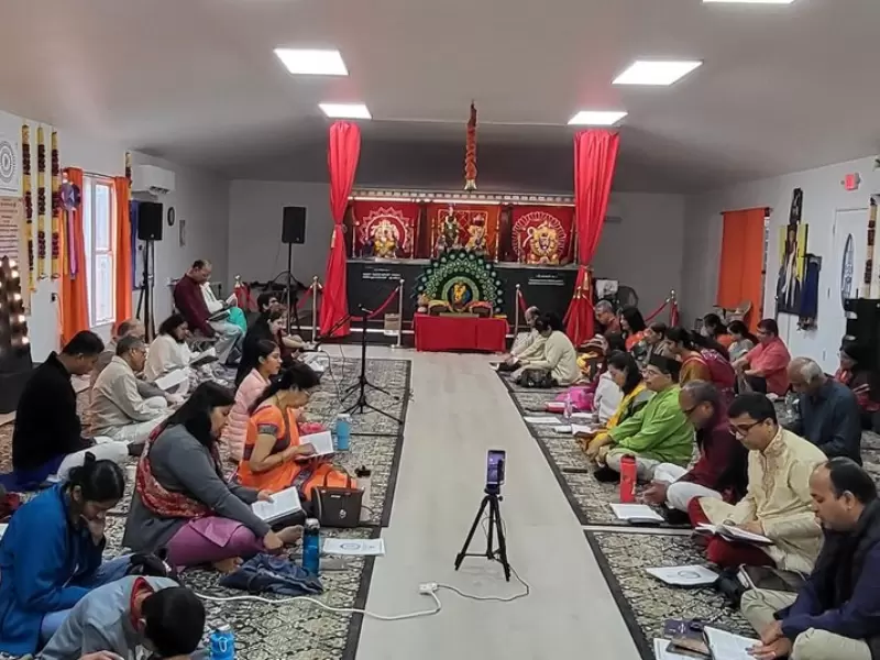सामूहिक पाठ और भगवद् गीता पर चिंतन में भाग लेते हुए उपस्थित लोग। / India in Houston via X