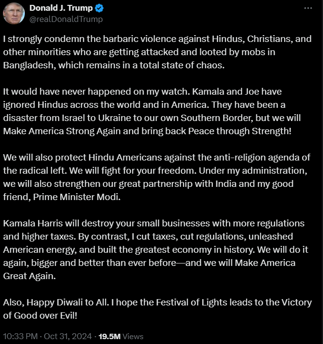 रिपब्लिकन राष्ट्रपति उम्मीदवार और पूर्व राष्ट्रपति डोनाल्ड ट्रम्प ने सभी को दीपावली की शुभकामनाएं दीं। उन्होंने Truth Social और X पर पोस्ट करते हुए यह भी कहा कि वह भारत के साथ अपने देश के संबंध मजबूत करेंगे। 'अपने अच्छे मित्र' प्रधानमंत्री नरेंद्र मोदी के साथ काम करेंगे। उन्होंने कहा कि उनकी डेमोक्रेटिक प्रतिद्वंद्वी उपराष्ट्रपति कमला हैरिस और राष्ट्रपति जो बाइडेन ने अमेरिका और दुनिया भर में हिंदुओं को नजरअंदाज किया है।