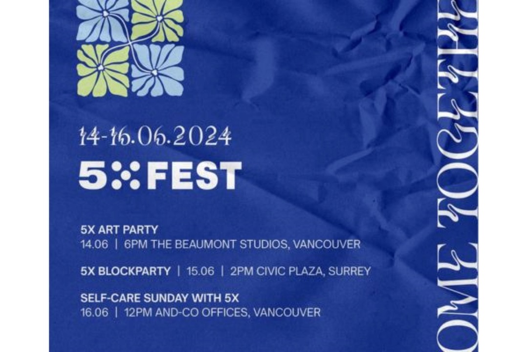 5X ब्लॉक पार्टी का आयोजन 15 जून को सरे सिविक प्लाजा में किया जाएगा, जहां लाइव संगीत के अलावा कलात्मक अनुकृतियों, खान-पान एवं कपड़ों की खरीदारी का भी लुत्फ लिया जा सकेगा। इस कार्यक्रम की मेजबानी ज्योति और कृपान ढिल्लों करेंगे। आम लोगों के लिए प्रवेश निःशुल्क है। कुछ चुनिंदा लोगों को 5X फेस्ट का ऑल एक्सेस वीआईपी पास जीतने का भी मौका मिलेगा।