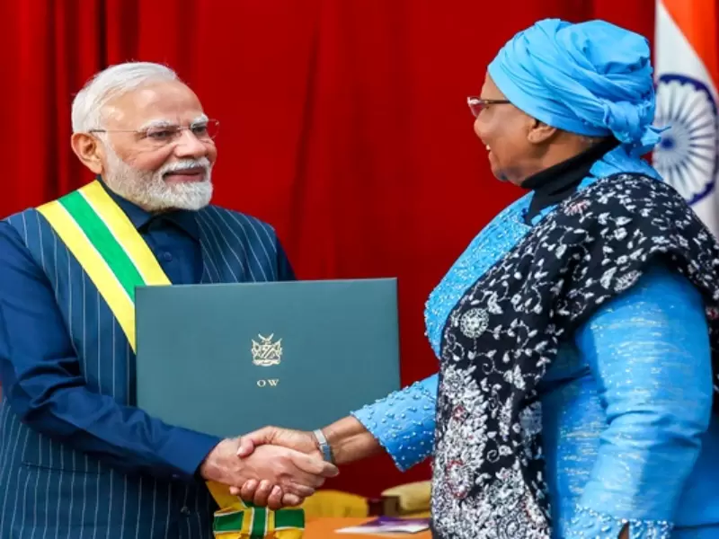 नामीबिया की राष्ट्रपति नेटुम्बो नंदी-नदैतवाह द्वारा बुधवार, 9 जुलाई, 2025 को विंडहोक में प्रधानमंत्री नरेंद्र मोदी को नामीबिया के सर्वोच्च नागरिक पुरस्कार 'द ऑर्डर ऑफ द मोस्ट एन्शिएंट वेल्वित्सचिया मिराबिलिस' से सम्मानित किया गया। / IANS/PMO