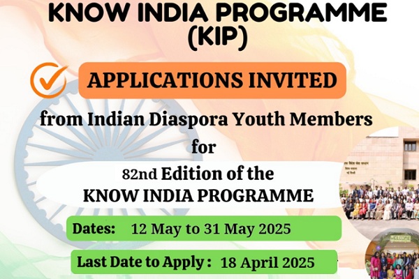 भारत के विदेश मंत्रालय ने 'भारत को जानो' कार्यक्रम यानी नो इंडिया प्रोग्राम (KIP) के 82वें संस्करण की घोषणा कर दी है। 12 मई से 31 मई, 2025 तक चलने वाले इस कार्यक्रम के लिए मंत्रालय की ओर से आवेदन मांगे गए हैं। आवेदन की आखिरी तारीख 18 अप्रैल 2025 है।