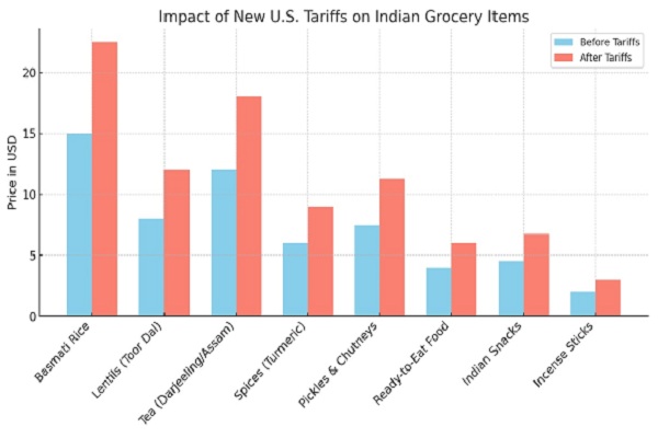 आयात आंकड़ों की हालिया समीक्षा के अनुसार भारतीय किराना आयात पर नए अमेरिकी टैरिफ से दुकानों और ग्राहकों दोनों पर असर पड़ने की उम्मीद है। चावल, मसाले और दाल जैसी प्रमुख खाद्य वस्तुओं की कीमतों में बदलाव हो सकता है जिसका असर भारतीय-अमेरिकी परिवारों की रोजमर्रा की किराना खरीदारी पर पड़ेगा।