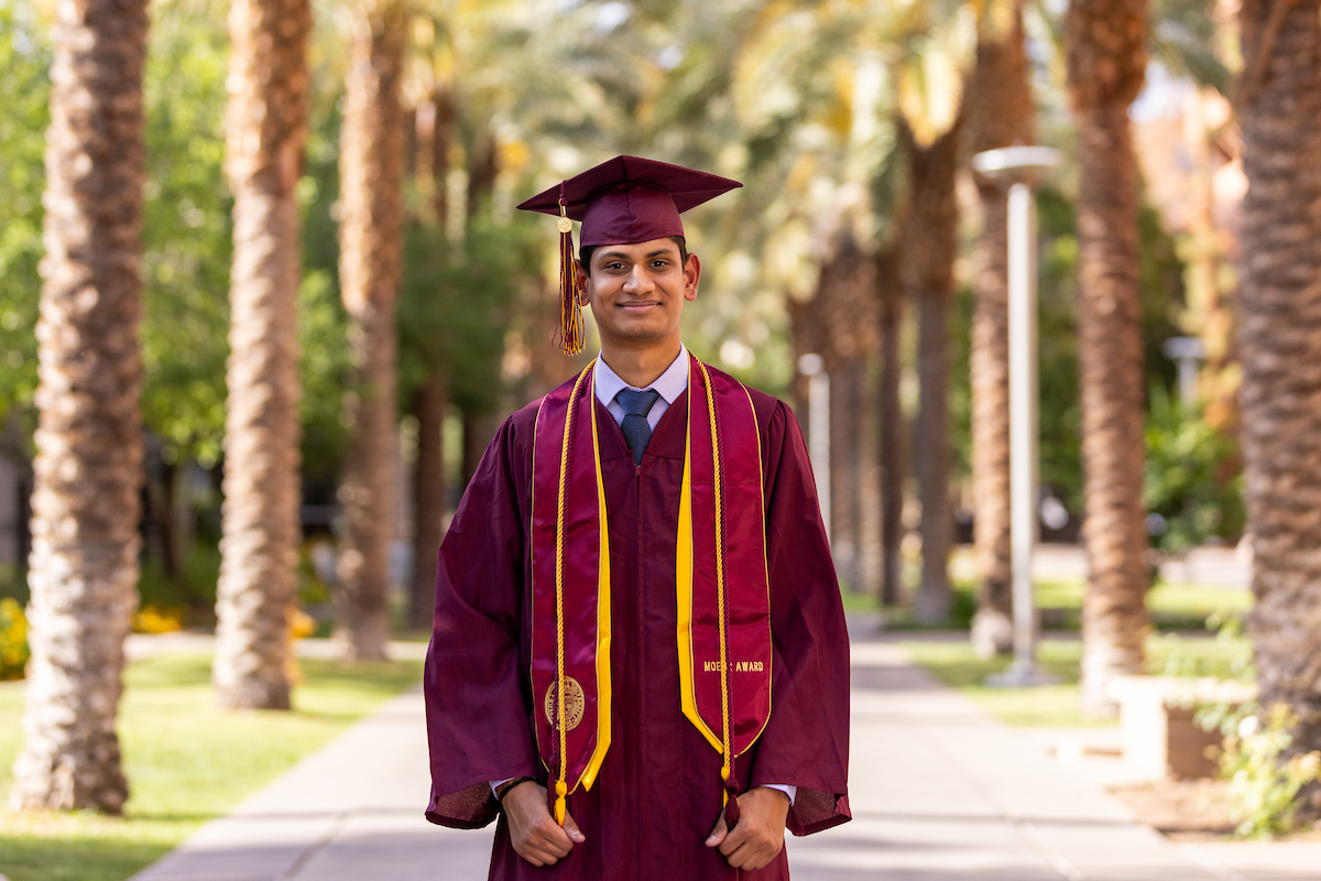 भारत से 1,800 सहित दुनिया भर से सन डेविल्स, समाज और अपने करियर को आगे बढ़ाने के लिए तैयार हैं। ASU अंतर्राष्ट्रीय छात्रों और उनकी सफलता के लिए प्रतिबद्ध है ASU के प्रतिष्ठित पाम वॉक में अपनी टोपी और गाउन के साथ ओंकार शेनॉय पोज़ देते हैं। स्नातक होने के बाद वे काम के लिए फिलाडेल्फिया जा रहे हैं।