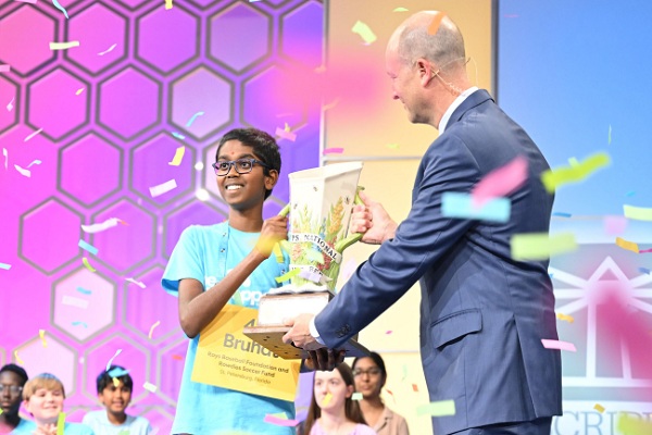ई.डब्ल्यू. स्क्रिप्स कंपनी के अध्यक्ष और सीईओ एडम सिम्सन ने सोमा को चैंपियनशिप ट्रॉफी प्रदान की। / Spelling Bee
