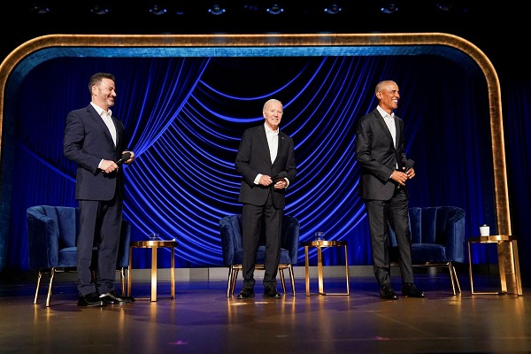 अमेरिकी राष्ट्रपति जो बाइडेन ने लॉस एंजिलिस के पीकॉक थिएटर में धन संचयन अभियान के दौरान पूर्व अमेरिकी राष्ट्रपति बराक ओबामा और देर रात के टॉक-शो होस्ट जिमी किमेल के साथ बातचीत में भाग लिया। / Reuters/Kevin Lamarque