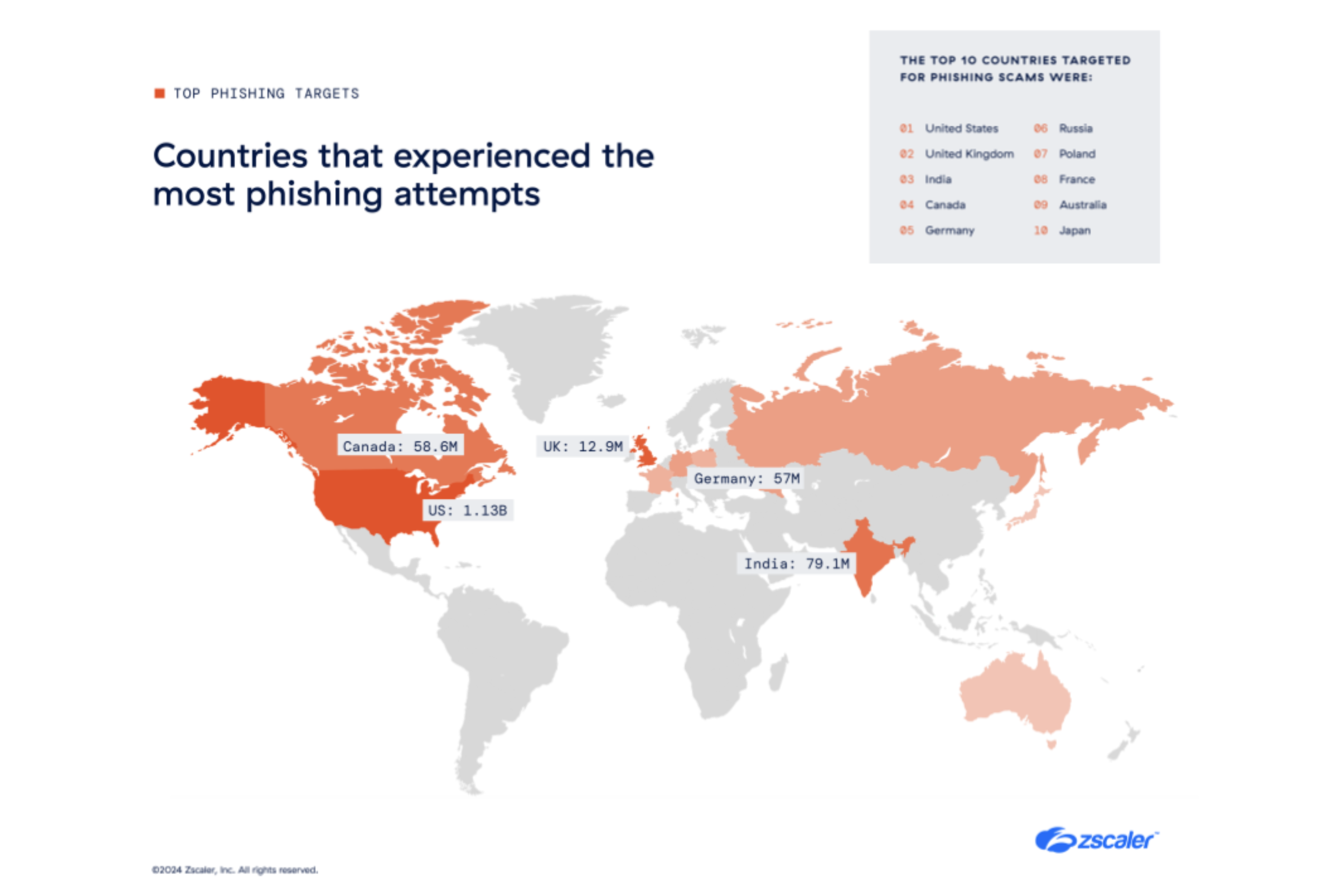 यह जानकारी Zscaler थ्रेट लैब्ज़ की फ़िशिंग रिपोर्ट 2024 से सामने आई है। दुनिया में फ़िशिंग ट्रेंड्स का व्यापक विश्लेषण करके यह रिपोर्ट तैयार की गई है। इसमें बताया गया है कि दुनिया में सबसे ज्यादा ऑनलाइन लक्षित हमले भारत, अमेरिका और यूनाइटेड किंगडम (यूके) में होते हैं।