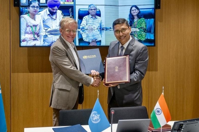 संयुक्त राष्ट्र जिनेवा में भारत के स्थायी प्रतिनिधि अरिंदम बागची और यूनिवर्सिटी हेल्थ कवरेज एंड लाइफ कोर्स के सहायक महानिदेशक डॉ ब्रूस आयलवर्ड ने समझौते पर दस्तखत किए। / Photo Credit- WHO