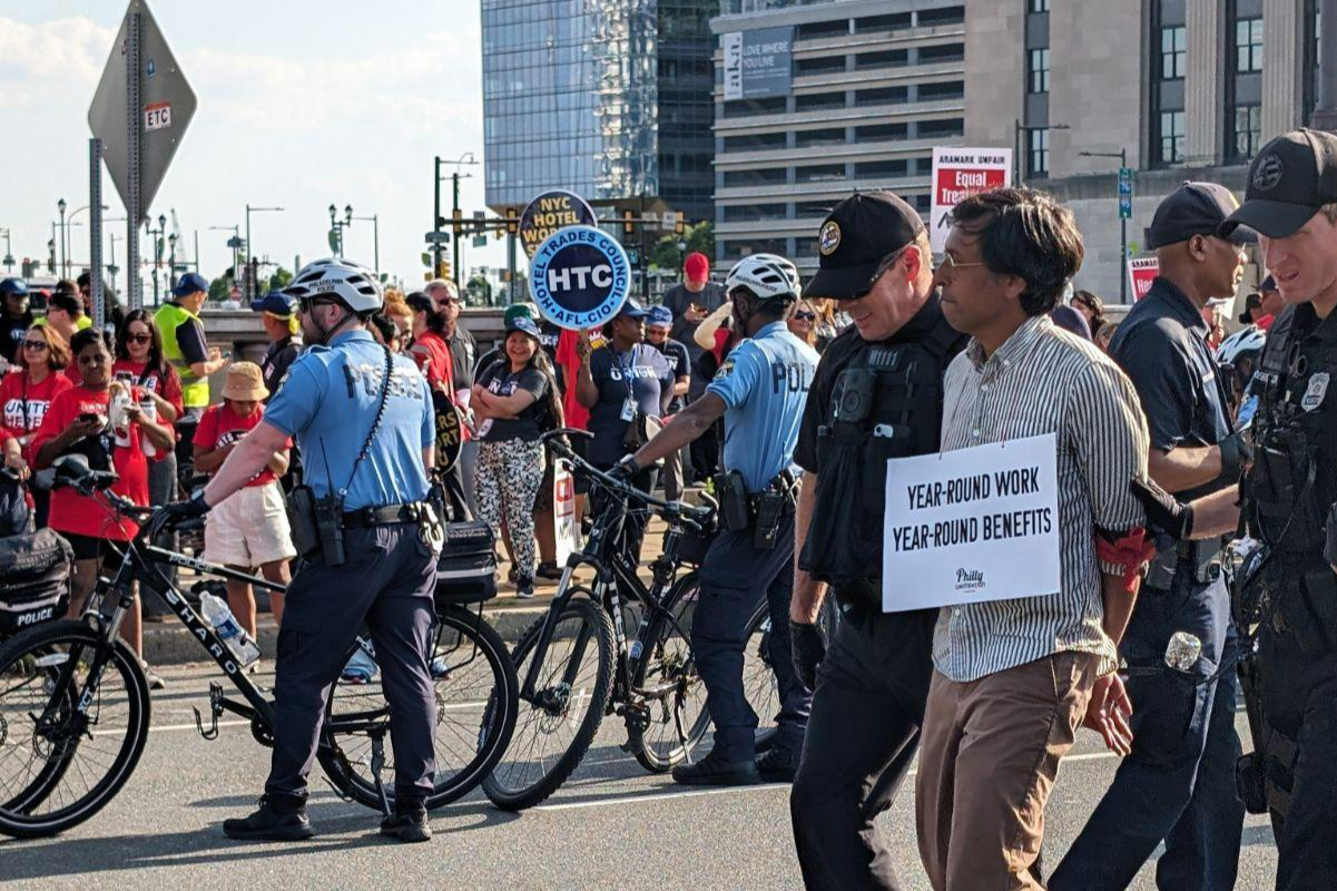 सैकड़ों की संख्या में ये कामगार वेल्स फार्गो सेंटर, सिटीजन बैंक पार्क और लिंकन फाइनेंशियल फील्ड में श्रमिकों के लिए बेहतर मजदूरी एवं स्वास्थ्य लाभ की मांग करते हुए 2400 मार्केट स्ट्रीट पर अरामार्क मुख्यालय के बाहर प्रदर्शन कर रहे थे।