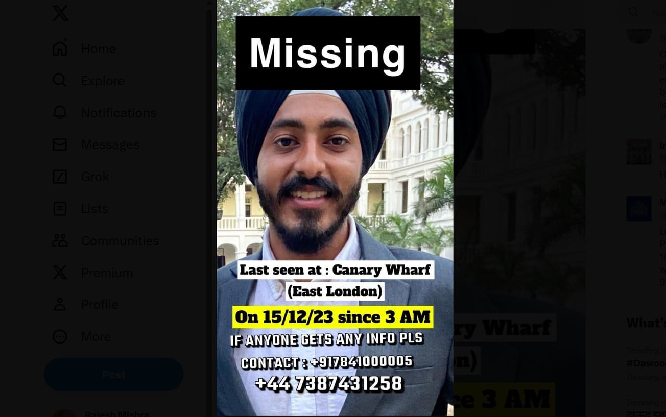 G S Bhatia, a student of Loughborough University, has been missing since Dec 15. Last seen in Canary Wharf, East London.