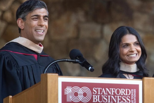 भारतीय मूल के दंपती ऋषि सुनक और अक्षता मूर्ति स्टैनफोर्ड विश्वविद्यालय के ग्रेजुएट स्कूल ऑफ़ बिज़नेस में 14 जून को दीक्षांत संबोधन के लिए पहुंचे। दोनों यहीं पर पहली बार एमबीए छात्र के रूप में मिले थे। फ्रॉस्ट एम्फीथिएटर में 2025 की कक्षा को संबोधित करते हुए दंपती ने धर्म के विचार पर कहा कि यह एक संस्कृत शब्द है जिसे उन्होंने परिणामों से लगाव के बिना कार्य करने के कर्तव्य के रूप में वर्णित किया।