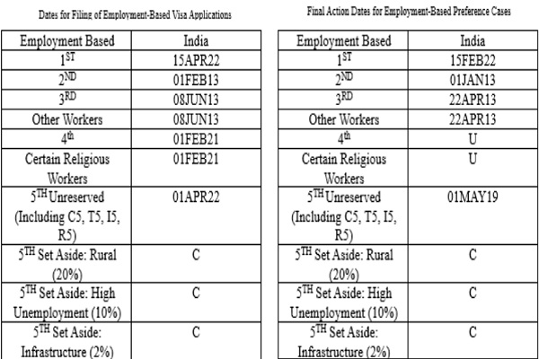 - रोजगार-आधारित तृतीय (कुशल श्रमिक, पेशेवर): ईबी-3 भारत की वीज़ा उपलब्धता की तिथि 22 अप्रैल, 2013 तक आगे बढ़ा दी गई