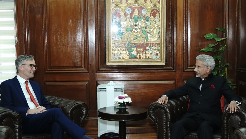 विदेश मंत्री एस जयशंकर ने कहा कि ब्रिटेन के उच्चायुक्त @AlexWEllis (बाएं) की विदाई पर उनका स्वागत करके खुशी हुई। हमारे द्विपक्षीय संबंधों को मजबूत करने के लिए उनका धन्यवाद। / @DrSJaishankar