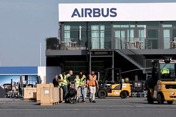 13 जून 2025 को फ्रांस के पेरिस के निकट ले बॉर्गेट हवाई अड्डे पर 55वें अंतर्राष्ट्रीय पेरिस एयरशो के उद्घाटन से पहले एयरबस का लोगो देखा जा सकता है। / Reuters /Benoit Tessier