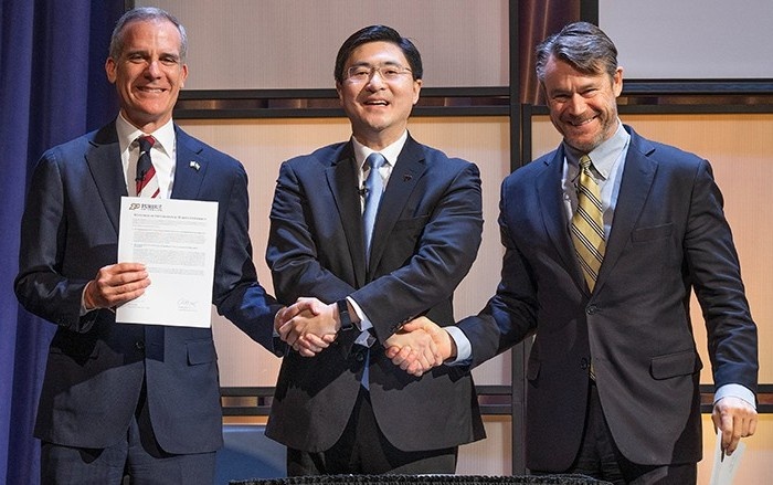 पर्ड्यू के प्रेसिडेंट मुंग च्यांग (बीच में) राजदूत एरिक गार्सेटी (बाएं) और अमेरिकी सेन टॉड यंग के साथ। / Purdue University photo/John Underwood)