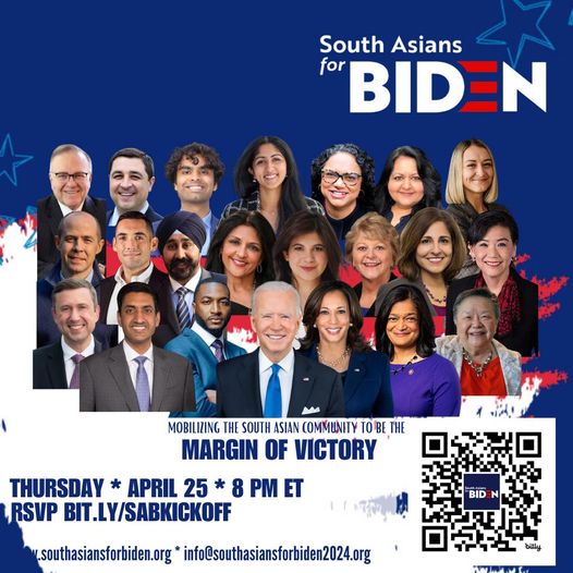 अमेरिका में राष्ट्रपति चुनाव की गहमागहमी के बीच राष्ट्रपति जो बाइडेन के समर्थन में एशियाई वोटरों को एकजुट करने के लिए विशेष वर्चुअल इवेंट का आयोजन किया जा रहा है। यह 'साउथ एशियंस फॉर बाइडेन' रीलॉन्च इवेंट 25 अप्रैल गुरुवार को ईस्टर्न टाइम के अनुसार शाम 8 बजे शुरू होगा।