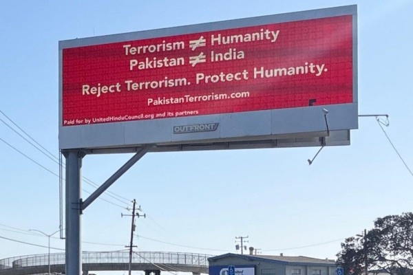 यह बिल बोर्ड कैलिफोर्निया के बे एरिया में स्थापित है। जिसमें पहलगाम, कश्मीर में हाल ही में 26 हिंदू पुरुषों की हत्या के बाद पाकिस्तान को आतंकवाद से जोड़ने वाले एक संदेश ने लोगों का ध्यान आकर्षित किया। घूमते हुए बिलबोर्ड संदेशों में से एक में लिखा है, "भारत मानवता के लिए खड़ा है और पाकिस्तान आतंकवाद के लिए।
