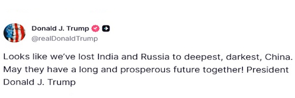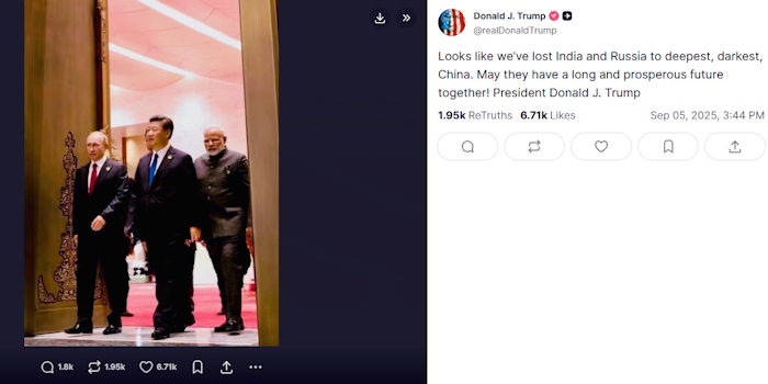 ट्रम्प ने सोशल मीडिया ट्रुथपर तियानजिन SCO शिखर सम्मेलन के दौरान कैप्चर की गई मोदी, पुतिन और शी की तस्वीर शेयर की और लिखा, "हमने भारत और रूस को सबसे अंधकारमय चीन के हाथों खो दिया। ईश्वर करे कि उनके संबंध लंबे चलें, भविष्य समृद्ध हो!"