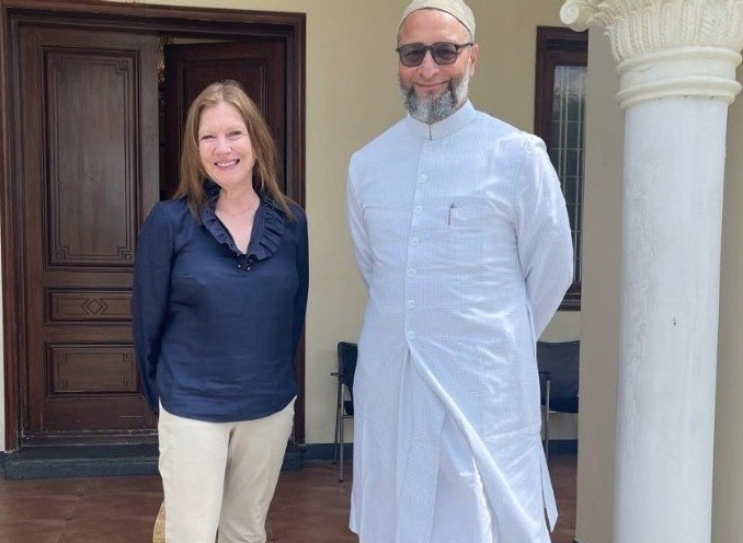 हैदराबाद में अमेरिकी महावाणिज्य दूत जेनिफर लार्सन और AIMIM के प्रमुख व हैदराबाद के सांसद असदुद्दीन ओवैसी। / X @USCGHyderabad