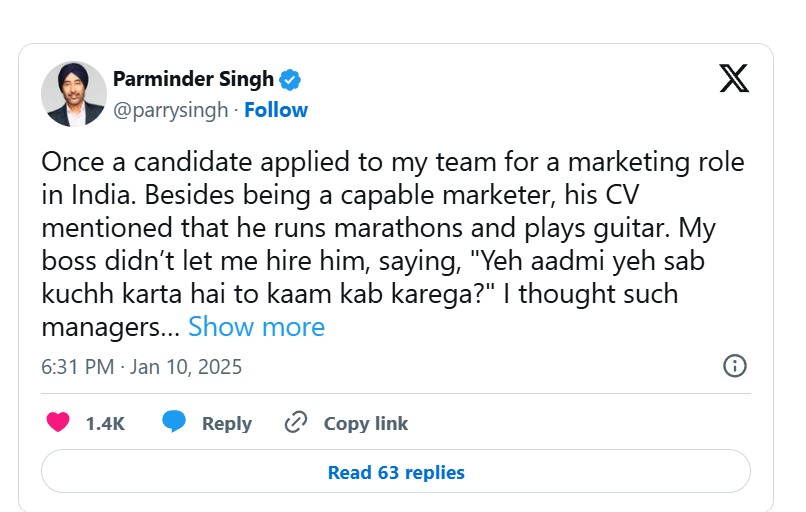 सिंह ने अपनी पोस्ट में बताया, 'एक बार एक उम्मीदवार ने भारत में हमारी टीम में मार्केटिंग की भूमिका के लिए आवेदन किया था। एक काबिल मार्केटर होने के अलावा उसके रिज्यूमे में लिखा था कि वह मैराथन दौड़ता है और गिटार बजाता है। मेरे बॉस ने मुझे उसे काम पर रखने नहीं दिया और कहा, 'ये आदमी अगर ये सब कुछ करता है तो काम कब करेगा?' सिंह ने उस 'काबिल' उम्मीदवार को न रख पाने पर अफसोस भी जाहिर किया।