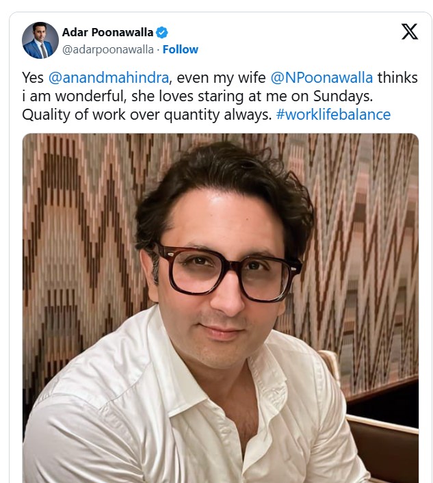 महिंद्रा ग्रुप के चेयरमैन आनंद महिंद्रा ने कहा, 'मैं एक्स पर इसलिए नहीं हूं क्योंकि मैं अकेला हूं। मेरी पत्नी बहुत अच्छी है, और मुझे उन्हें निहारना बहुत पसंद है।' L&T के चेयरमैन के बयानों के बाद, सीरम इंस्टिट्यूट ऑफ इंडिया के सीईओ और मालिक, पूनावाला फिनकॉर्प के चेयरमैन अदार पूनावाला ने एक्स पर अपने विचार साझा किए। उन्होंने लिखा, 'हां, आनंद महिंद्रा और यहां तक कि मेरी पत्नी को भी लगता है कि मैं बहुत अच्छा हूं। उन्हें रविवार को मुझे घूरना बहुत पसंद है। काम की क्वॉलिटी, संख्या से ज्यादा महत्वपूर्ण है।'