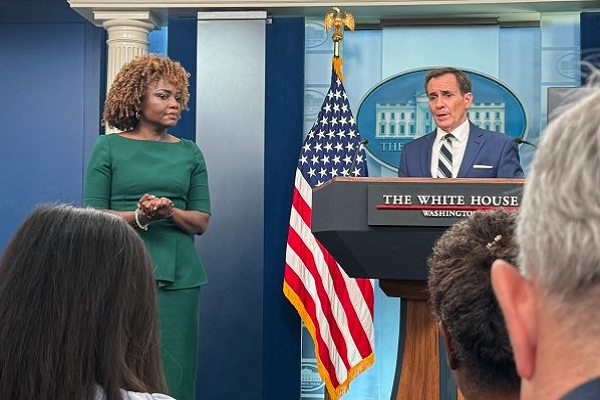 व्हाइट हाउस के राष्ट्रीय सुरक्षा संचार सलाहकार जॉन किर्बी (डायस पर) और कैरिन जीन-पियरे (बाएं) 17 मई को एक प्रेस वार्ता के दौरान। / Courtesy Photo