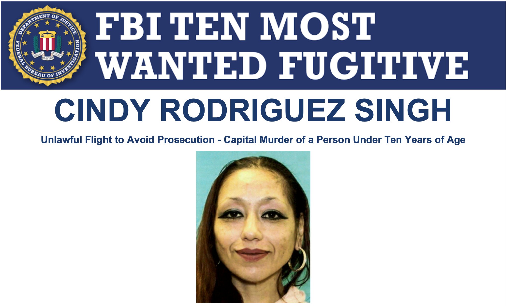 अमेरिका की खुफिया एजेंसी FBI ने एक चौंकाने वाले मामले में 6 साल के मासूम बेटे की हत्या के आरोप में सिंडी रोड्रिग्ज सिंह को अपनी 10 मोस्ट वांटेड भगोड़ों की सूची में शामिल किया है। इस महिला की गिरफ्तारी पर 2.08 करोड़ रुपये ($2,50,000) का इनाम घोषित किया गया है।